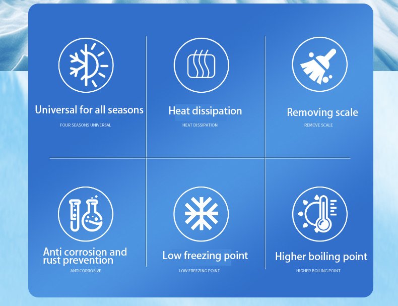 Excellent corrosion resistance: Contains corrosion inhibitors that can protect metals (copper, aluminum, steel, solder) and non-metallic materials in the cooling system.